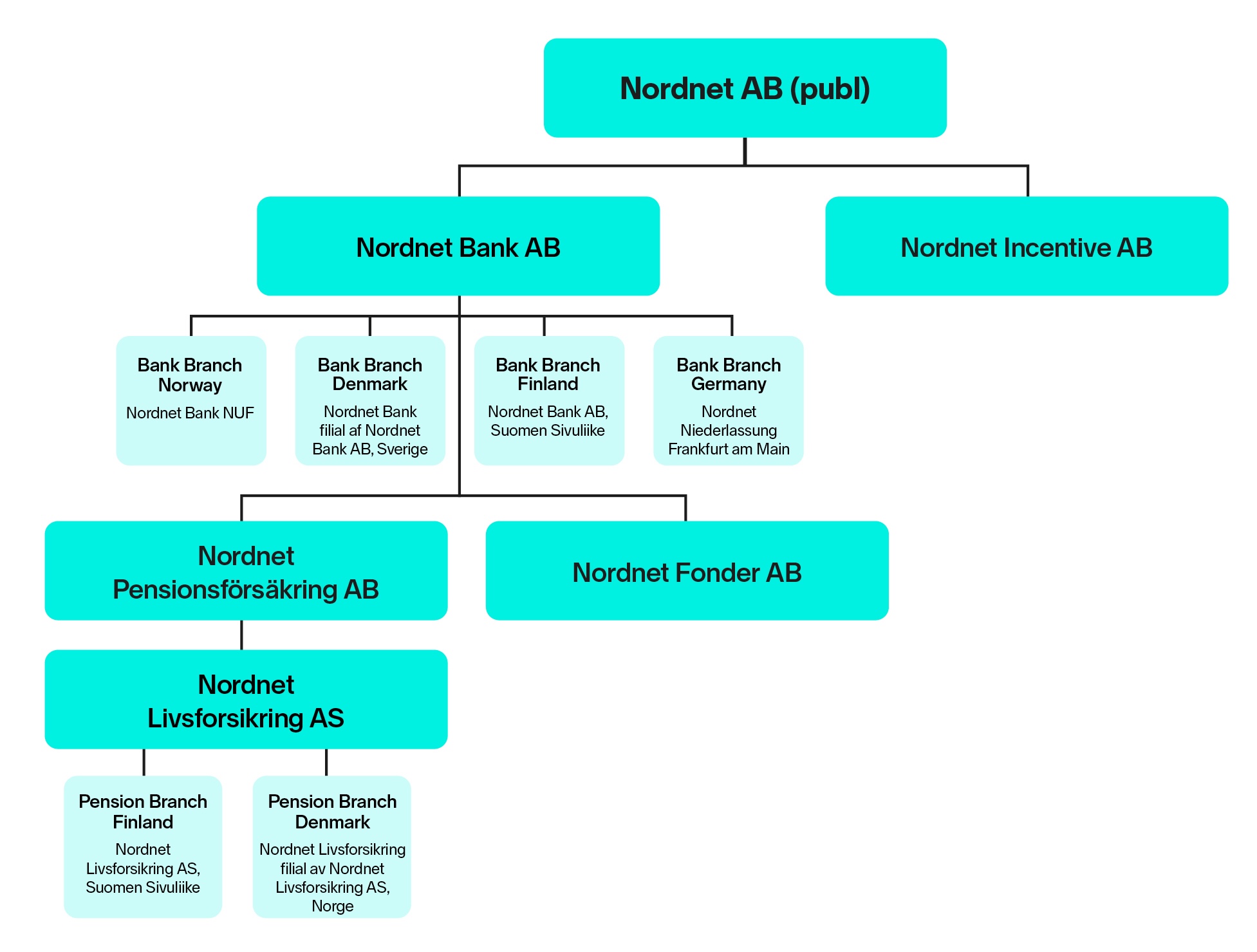 Nordnet Bank AB and Nordnet Incentive AB are subsidiaries to Nordnet AB (publ). Nordnet Fonder AB and Nordnet Pensionsförsäkring AB are subsidiaries to Nordnet Bank AB. Nordnet Livsforsikring AS, based in Oslo in Norway, is a subsidiary to Nordnet Pensionsförsäkring AB.